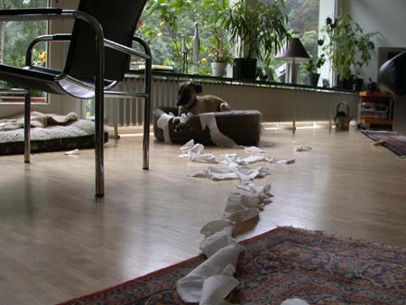 Aber wer hat denn die Toilettenpapier Rolle im Wohnzimmer ausgerollt? Der Basch war das nicht ! ! !