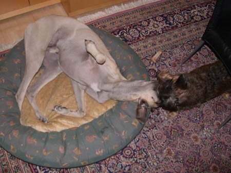 Kleine Geschichte am Rande: Als wir Jule die Tabletten 2mal Täglich geben mußten hatten wir uns zu Beginn immer den Wecker in der Küche gestellt um den Termin nicht zu vergessen. Das hat dann dazu geführt, dass Jule immer in die Küche geht wenn dort der Wecker klingelt (auch wenn dann nur die Nudeln fertig sind. . .