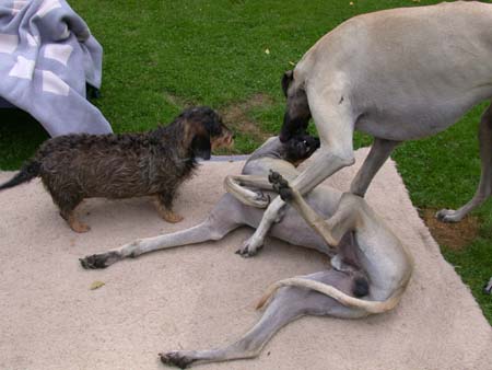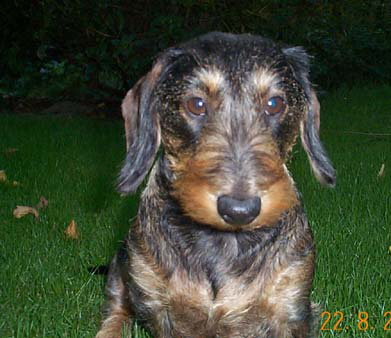 Jule ist im Sommer 1996 zu uns gekommen.  Da Christiane zu dieser Zeit keinen “großen” Hund mehr haben wollte (sie ist ehemalige Afghanenbesitzerin) sollte der nächste Hund ein kleiner, eigenständiger, pflegeleichter Hund werden Es ist dann eine Rauhhaardackel Dame geworden.