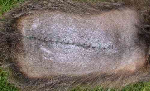 Die Naht ist zwar nicht schön gerade, Hauptsache die Narbe hat sich nicht entzündet (da wächst ja auch bald wieder Fell drüber). In der nächsten Woche werden dann die Fäden gezogen.